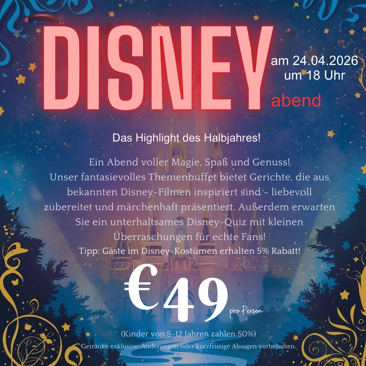 Erleben Sie einen Abend voller Magie, Genuss und guter Laune. Unser fantasievolles Themenbuffet präsentiert liebevoll zubereitete Gerichte, inspiriert von bekannten Disney-Filmen – märchenhaft angerichtet und geschmacklich vielseitig.